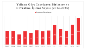 - Birleşme Devralma Dosya Sayısı: 2025 yılında Rekabet Kurulu (“Kurul“), toplam 416 dosyayı incelemiş ve karara bağlamıştır. 2024 yılına kıyasla, karara bağlanan birleşme ve devralma başvuru dosyası sayısında yaklaşık %34 oranında bir artış gözlenmiştir. Aynı zamanda, 2024 yılında 311 dosya ile kaydedilen en yüksek dosya yükü sayısı rekoru, 2025 yılında yüzden fazla sayıda dosya ile aşılmıştır.